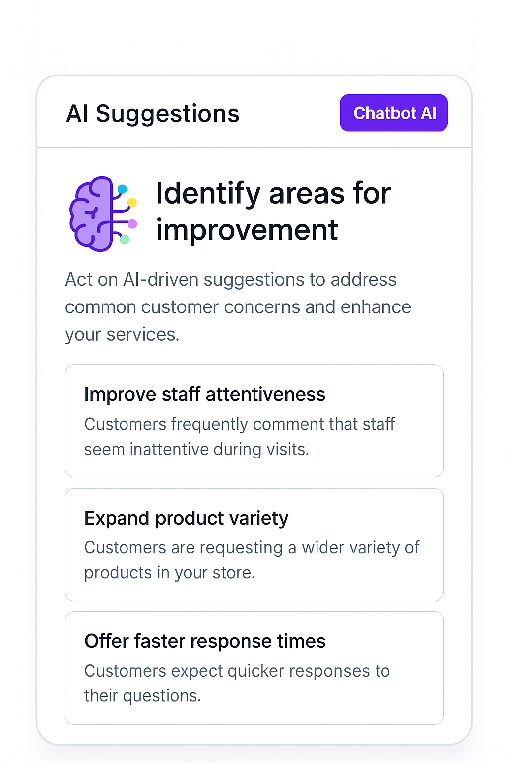 Every week, get a tailored report in your inbox that highlights top themes, recurring issues, and customer sentiments plus smart, practical suggestions on what to improve next in your business.